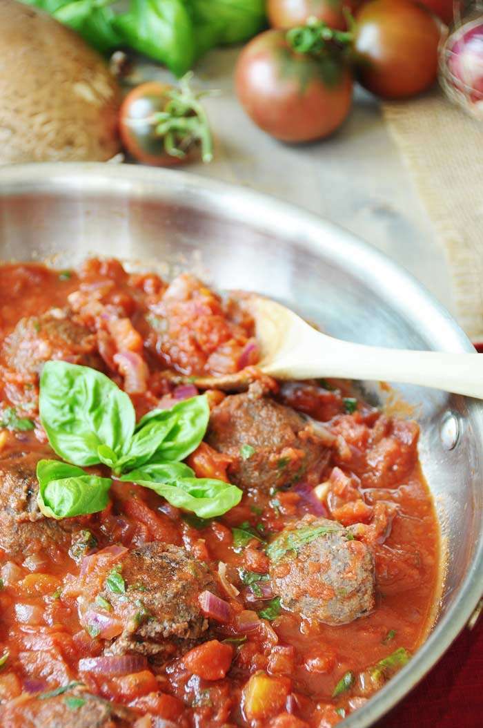 - Heat the oil in a large sauté pan on medium heat. When the oil is hot, add the onion and sauté until soft and translucent, approximately 5 minutes. Add the garlic and cook for one minute. Add the tomato, wine, Italian seasoning, pepper flakes and salt and pepper and stir well to combine. Bring to a boil then reduce the heat to simmer and cook for 30 minutes. Stirring occasionally. Add the basil and parsley when you add the bean balls and simmer for 15 more minutes.