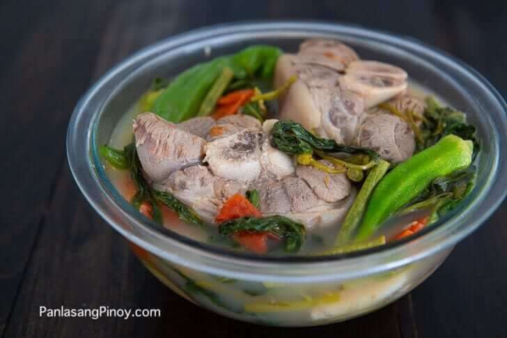 Pork hock soup in sour tamarind broth with taro and vegetables.
