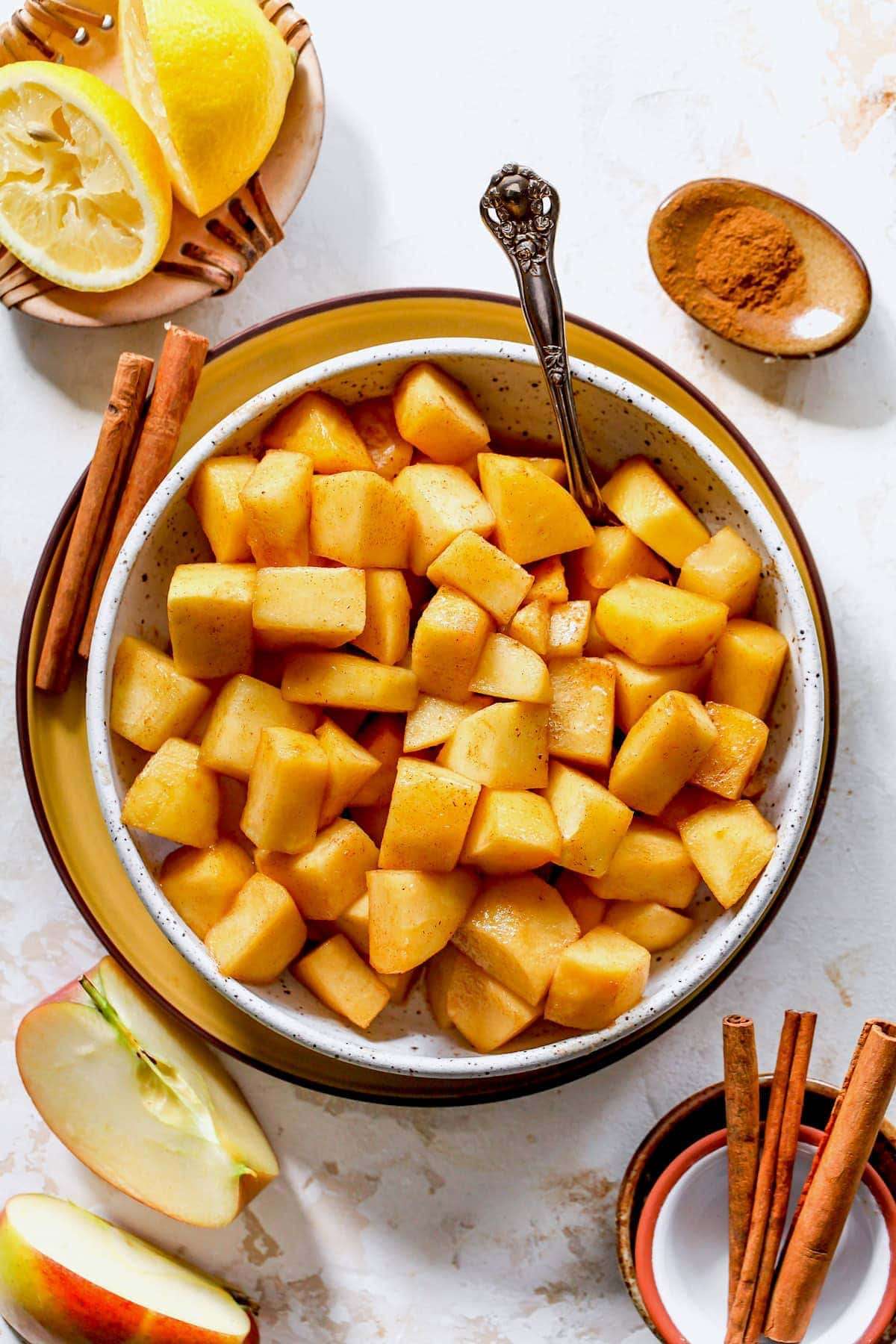 - Place the chopped apples in a medium bowl. Drizzle with lemon juice and stir. Add the brown sugar and cinnamon and stir until the apples are well coated.