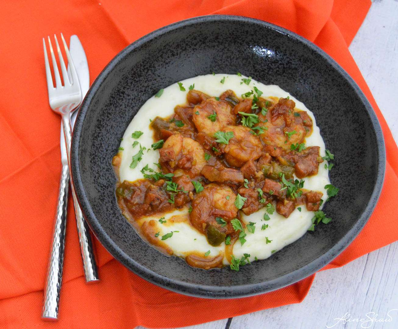 This skillet shrimp recipe is full of incredible flavors. It features plump juicy shrimp, ham, bell peppers and lotsa garlic, in an easy buttery wine sauce. It's perfect over white rice, grits, pasta or my favorite, mashed yuca!