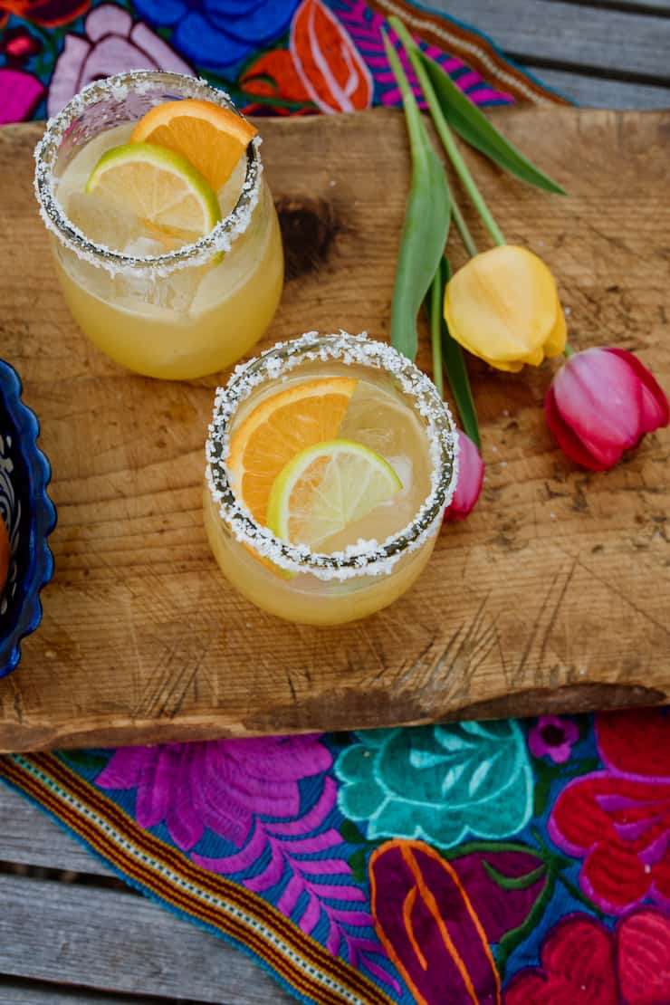 - Combine ingredients well and serve over ice. Don’t forget to garnish rims of glasses with coarse salt lime and orange slices.