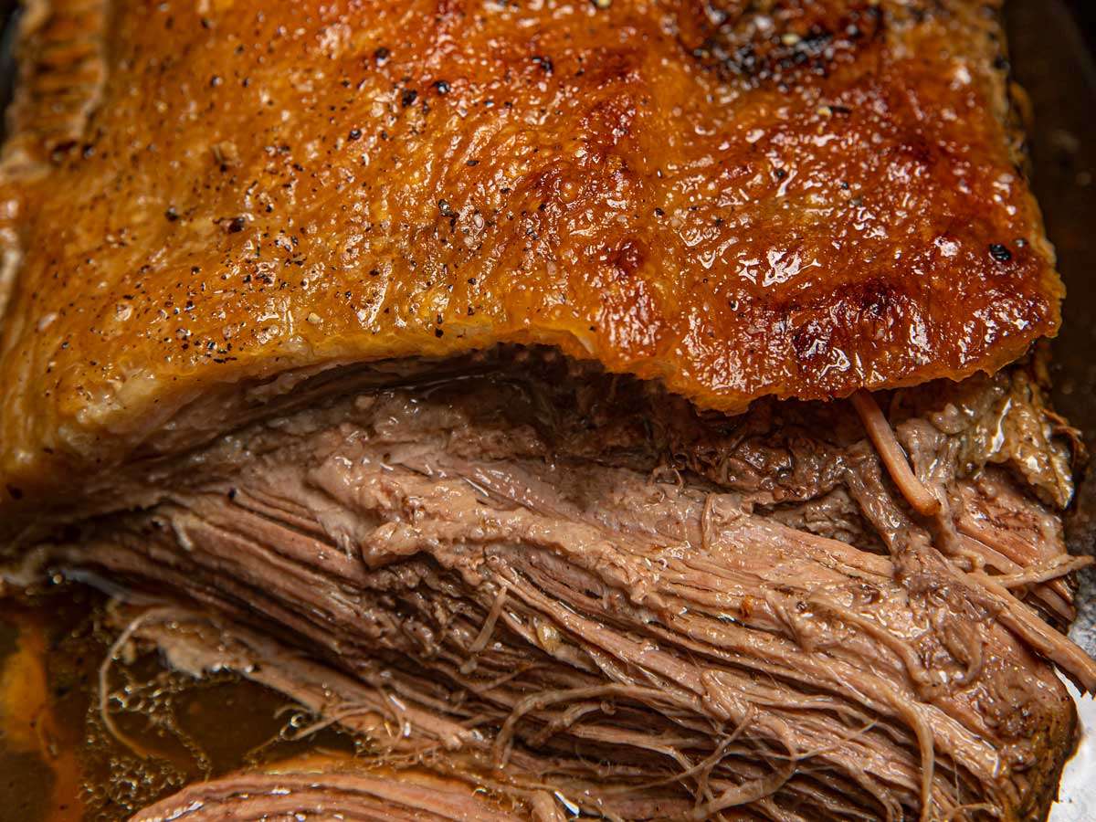 - Season the brisket with the salt and pepper and rub the garlic all over it.