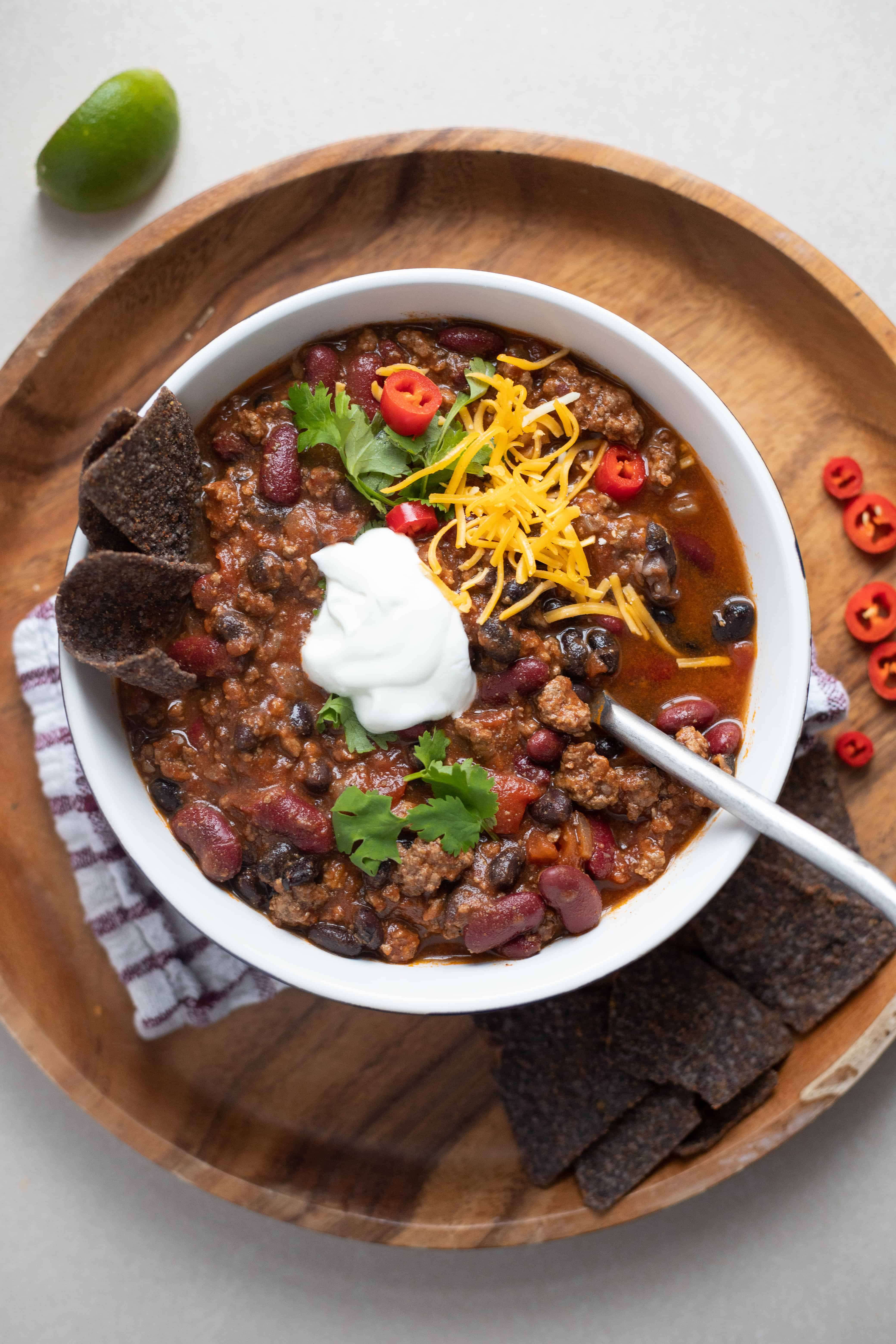 - Once the chili has thickened and is ready, stir in the drained cans of beans and leave to cook 15-20 minutes longer. Serve with desired toppings, and alongside rice, quinoa, cornbread or on top of baked sweet potatoes!