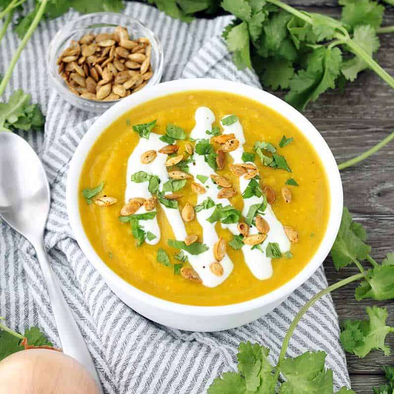 This slow cooker butternut squash soup is packed with flavor from curry, ginger, and other spices like turmeric. It's vegan, super creamy, and paleo/whole30 compliant!