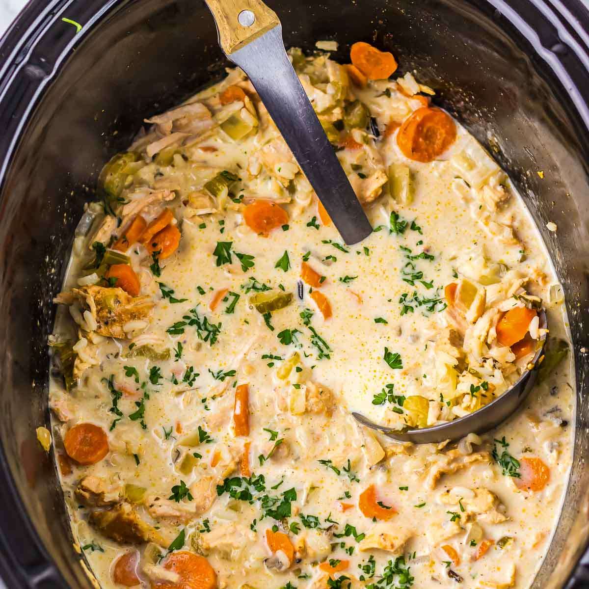 Warm up with a comforting bowl of slow cooker chicken and rice soup. Packed with tender chicken, fluffy rice, and veggies in a flavorful broth.