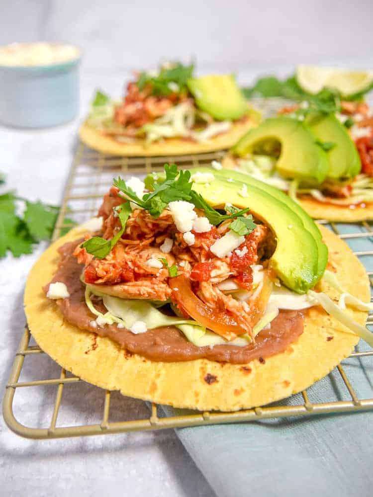 - You can make tacos with the shredded chicken tinga by grilling the corn tortillas or you can fry them to make tostadas. Then spread refried beans on the tortilla, followed by shredded lettuce, then the chicken tinga, topped with avocado, cotija cheese, and fresh cilantro.