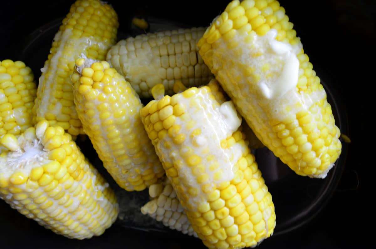 - Once the corn is cooked, drain the water. Place the stick of room temperature butter in the slow cooker, place the lid on and let the butter melt (about 5 minutes with heat off). Enjoy immediately or let sit covered until ready to eat.