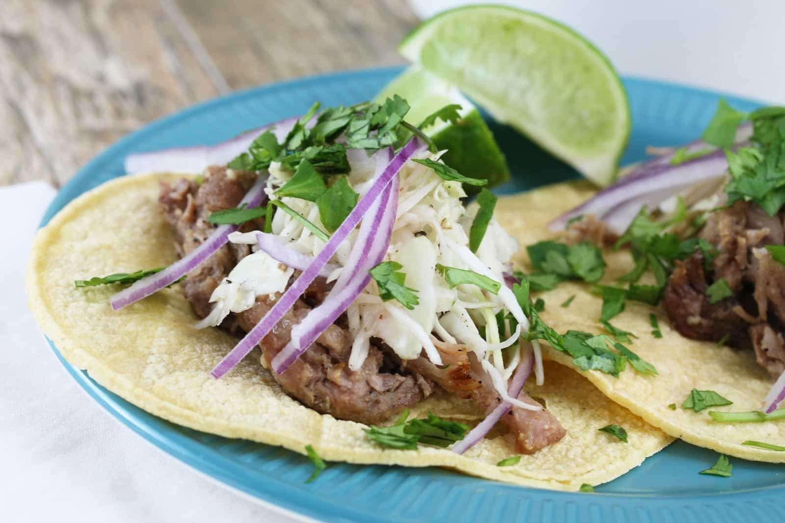 - Shred pork and serve on corn tortillas with cabbage slaw, sliced red onions, and freshly chopped cilantro.