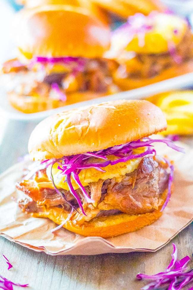 - Slice your buns, place the pulled pork inside, top with a browned pineapple slice, optional red cabbage, and serve. Extra pulled pork will keep airtight in the fridge for up to 5 days or in the freezer for up to 3 months.