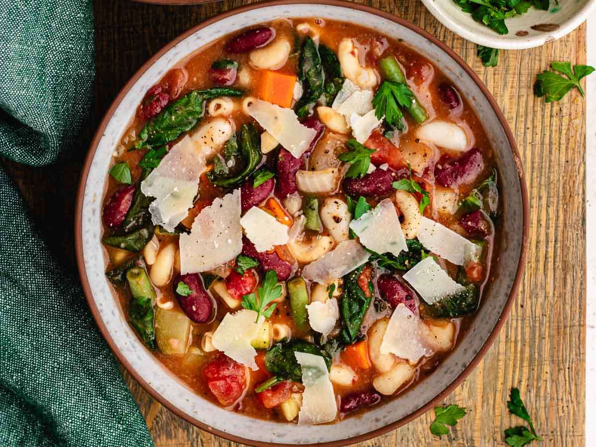 - Add the diced tomatoes, tomato paste, parmesan, vegetable stock, water, carrots, celery, onions, garlic, oregano, rosemary, bay leaves, kosher salt, black pepper, kidney beans, great northern beans and pureed cannellini beans to a slow cooker.