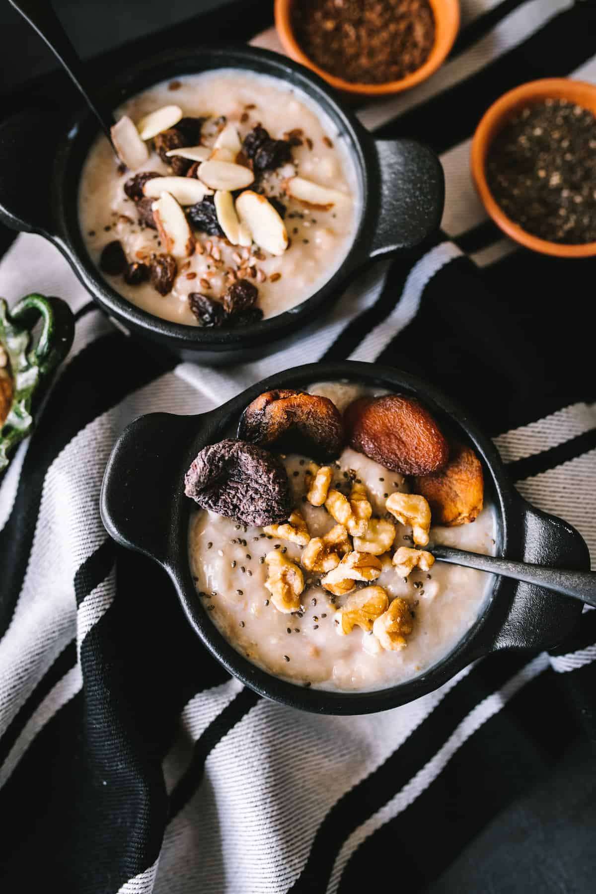- Ground cinnamon, nuts and chia or flax seeds to garnish