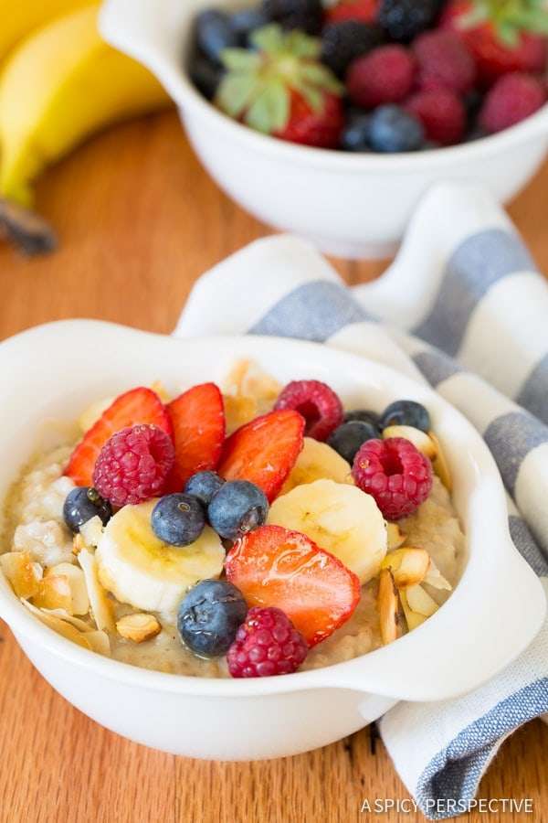 - Cover the slow cooker and turn on low for 9-11 hours. Stir again and serve the oatmeal warm topped with your favorite oatmeal add-ins: berries, bananas, toasted nuts, coconut, dried fruit, honey, brown sugar, etc.