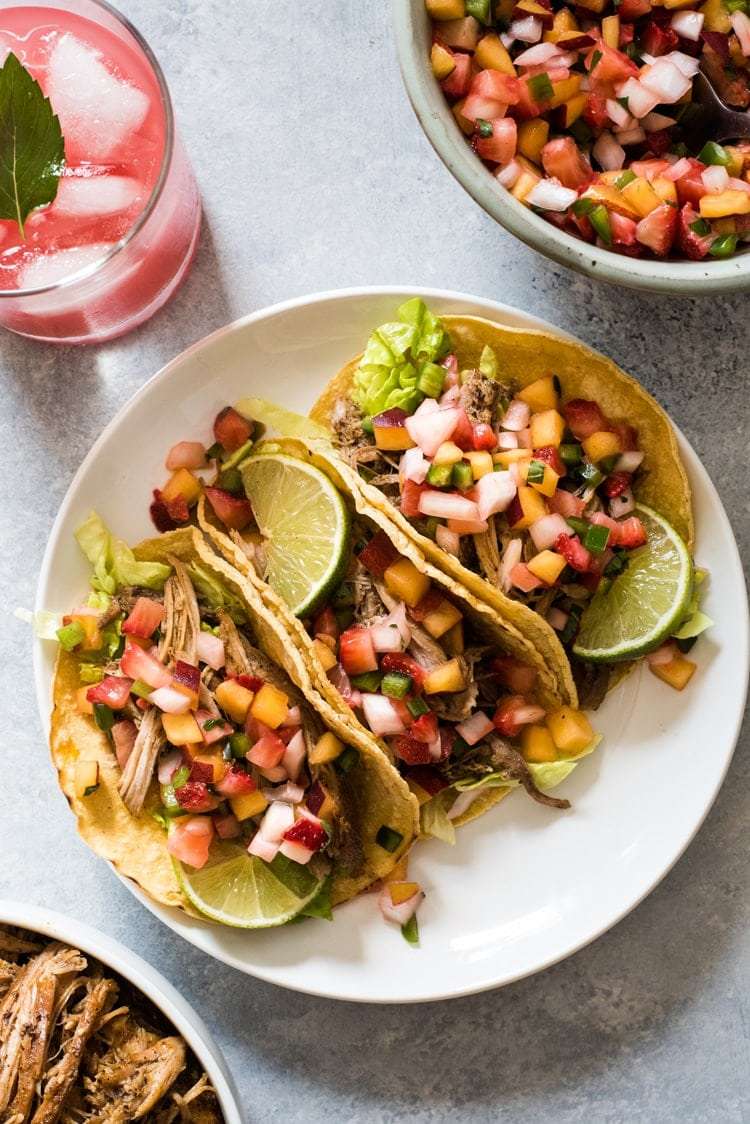 - Remove bones and shred/pull apart meat using a fork. Serve in corn tortillas (or lettuce cups or buns) and top with peach strawberry salsa.