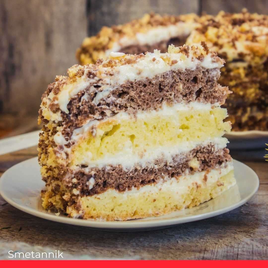 - The Smetannyk cake is made using 2 different sponges: a light colored one and a dark one. You can prepare these individually (in case you have just one baking tray, for example - simply halve the quantities of each ingredient used and make each batter one at a time), but to keep things simple and speed up the baking time, we'll make one big batch of sponge batter and divide them into 2 baking trays before placing them in the oven.