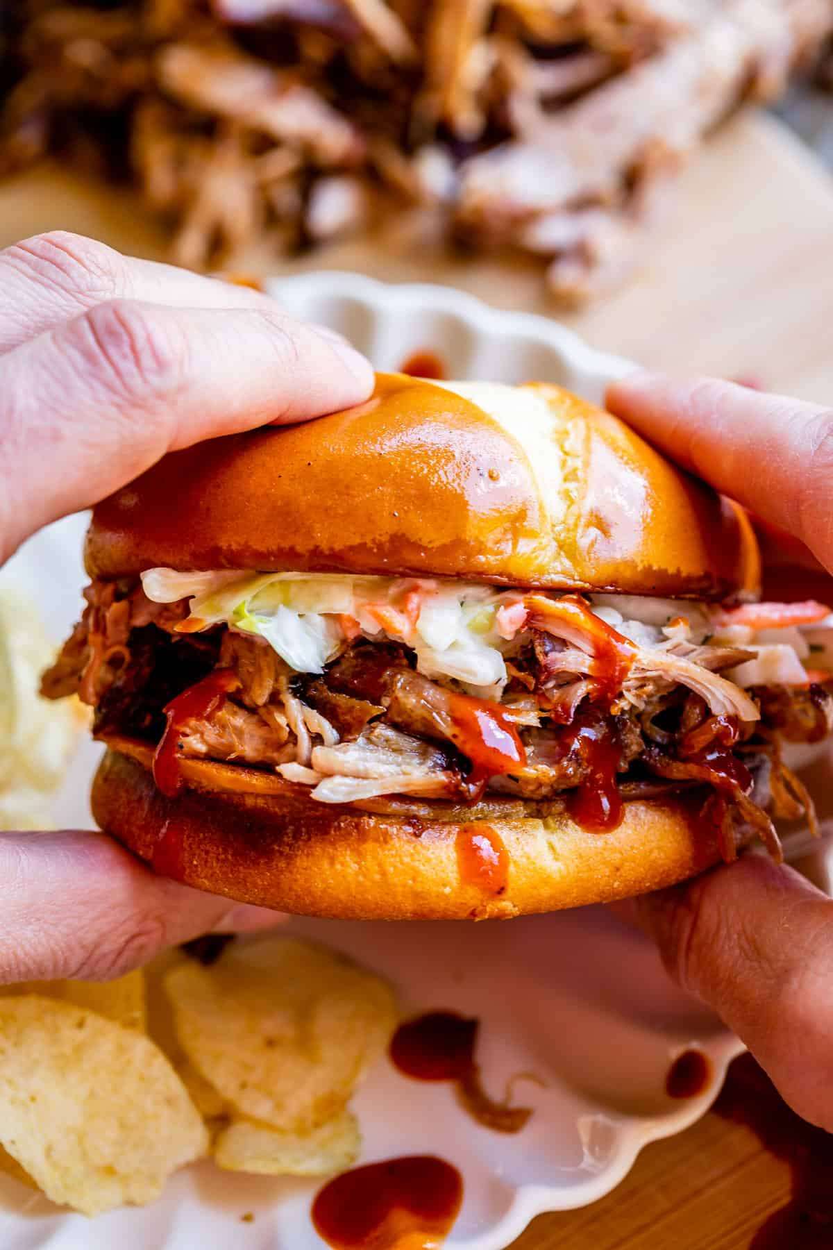 - Add shredded pork to your bun. Top with BBQ sauce, if desired. Top with an unreasonable amount of lemony herb coleslaw, if you're like me. Smash with the top of your toasty brioche bun and devour messily. If you are not qualifying for a Carl's Jr. commercial by the end of eating this thing, you're not doing it right.