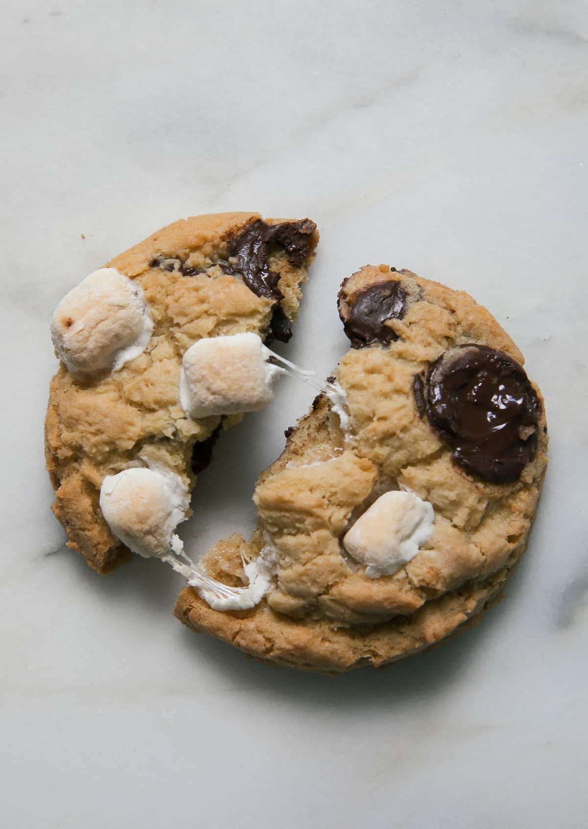 - Scoop out 6 balls of dough and space them apart onto the baking sheet. Transfer to the oven to bake for 5 minutes. At the 5-minute mark, pull the tray out of the oven and carefully push 3 to 4 mini marshmallows into the tops of the cookies. Place them back in the oven to bake for an additional 6 to 7 minutes, until the marshmallow is lightly golden brown and the cookies have baked. Allow to cool on the baking sheet for 5 minutes and then transfer to a cooling rack.