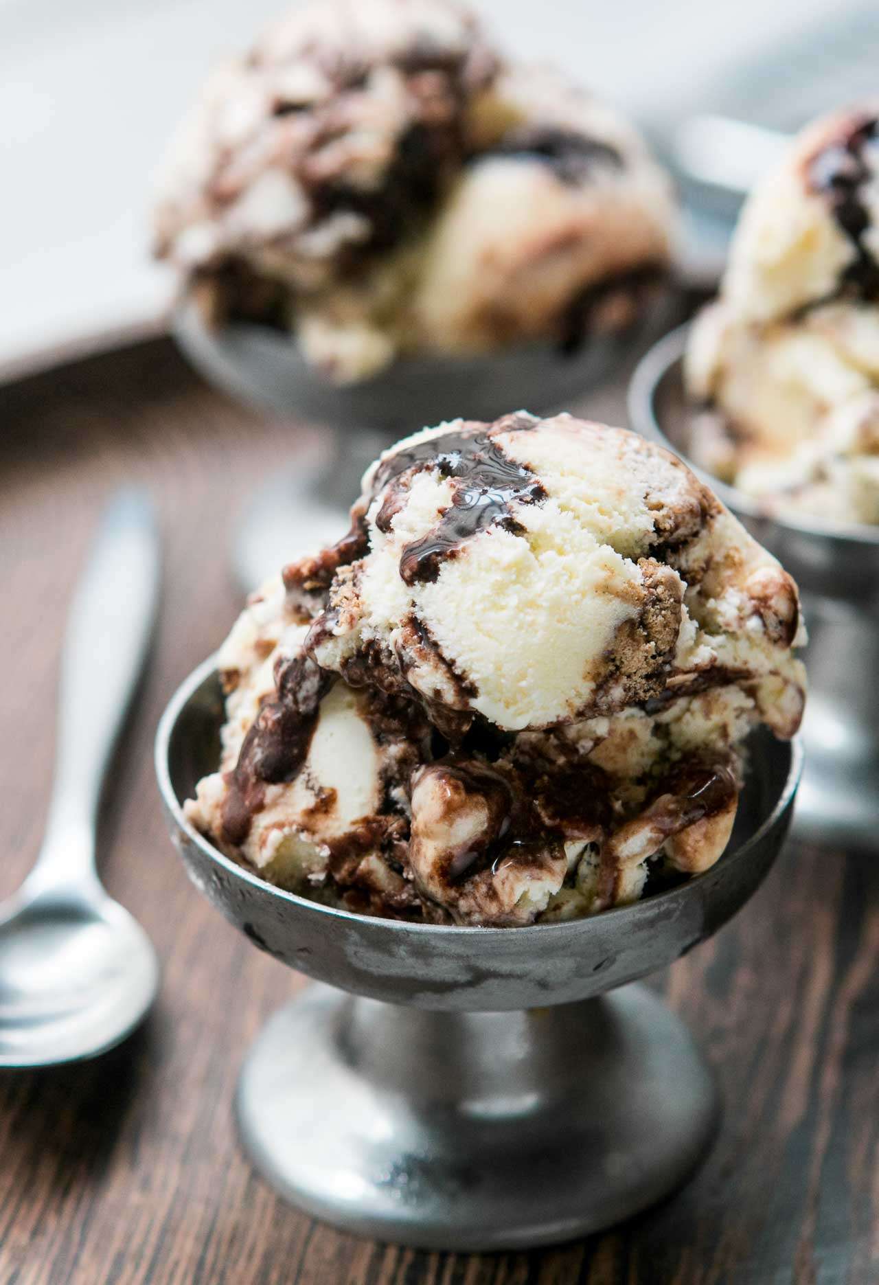 - Continue to layer the churned ice cream custard spooning some of the chilled fudge ripple mixture over the custard along with toasted marshmallows and crumbled graham cracker bits. If necessary, stir it very, very, gently, just to incorporate the ingredients, but not enough to mash everything together, which will make the finished ice cream muddy. Once done, freeze the ice cream and let stand for a few hours in the freezer until firm enough to scoop.