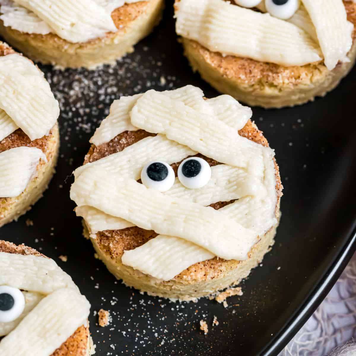 - You can either spread frosting over cooled blondie bars and cut into squares. OR if you want to make the mummy bites, use a 1.5 inch cookie cutter to cut circles out of blondie bars.