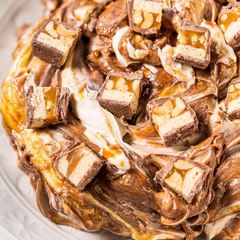🍫🥜😍 An EASY dessert dip with cream cheese, chopped candy bars, peanuts, milk chocolate, and chocolate caramel! Quick to make and perfect for dipping!
