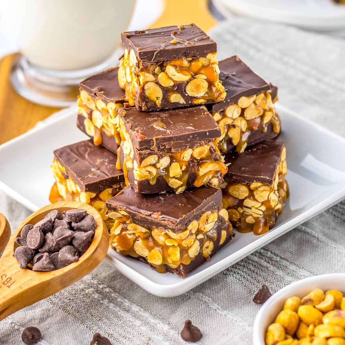 - In another microwave-safe bowl, microwave the chocolate chips for 30-50 seconds, stirring every 15 seconds until melted. Pour over top of the caramel layer and spread.