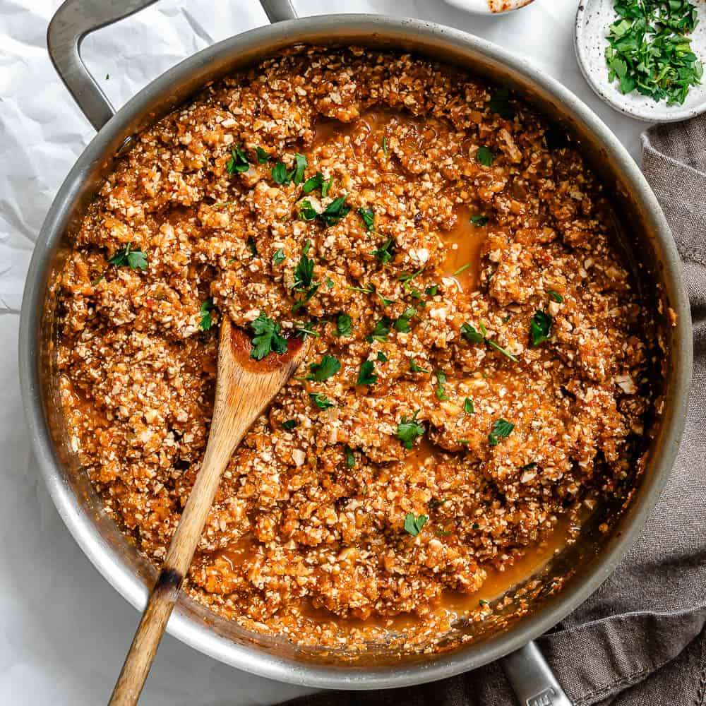 - In the cup of a food processor, add the bell pepper, onion, chipotle chile, garlic cloves, cumin, oregano, and the diced tomatoes. Pulse unitil a salsa consistency is achieved. Add the tofu and pulse until the tofu is chopped into lentil size pieces.