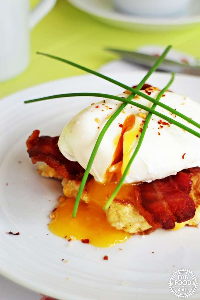 Soft Poached Eggs, Sweetcorn Frittas and Crispy Bacon