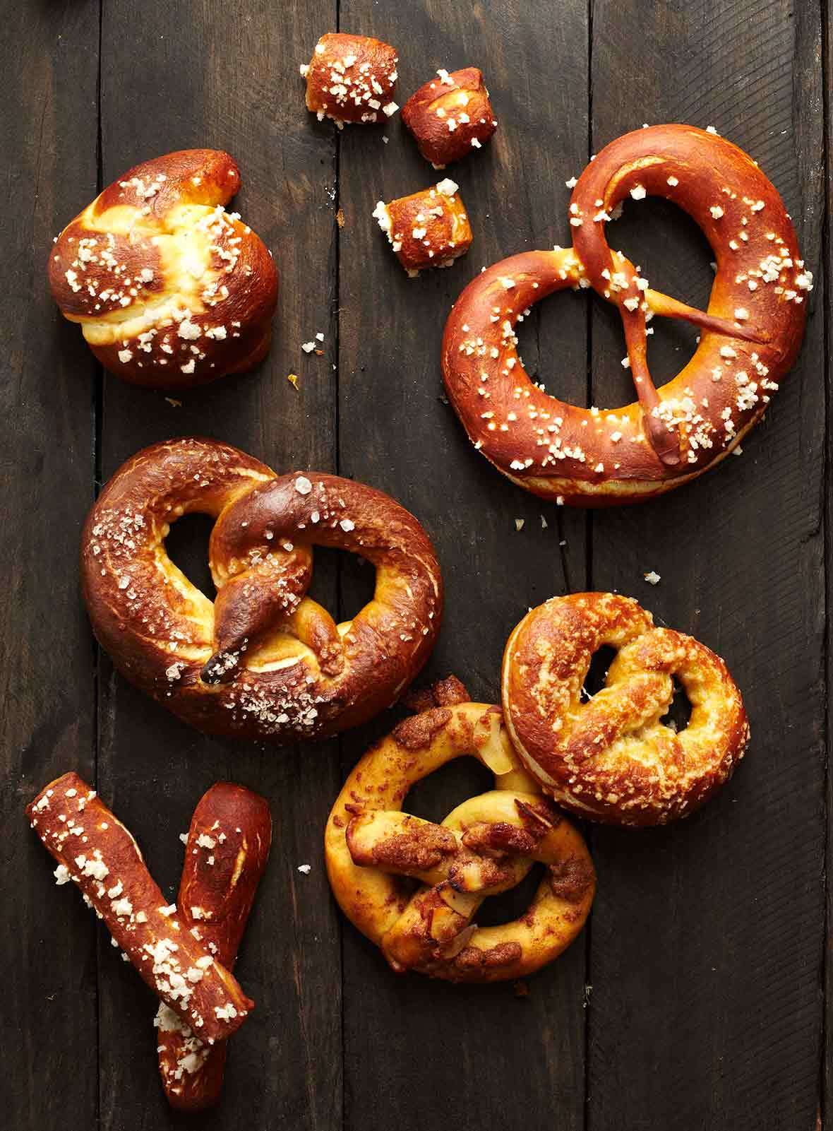 - These are the perfect snack when you’re watching a movie. To create bite-size pretzels, make the following changes: Reduce the ingredients to make a half batch of the dough, using the following amounts: 1 1/2 teaspoons yeast, 1/4 cup warm water, 1 1/2 teaspoons barley malt syrup or firmly packed dark brown sugar, 1 1/2 cups plus 2 tablespoons (210 grams) unbleached bread flour, 1/4 cup cold, pilsner-style beer, 1 tablespoon unsalted butter (cubed, at room temperature), and 1 teaspoon fine sea salt. Divide the dough into 8 equal portions. Shape each portion of dough into a 12-inch rope, applying even pressure as you roll from the center of the dough to the ends to avoid tapering the ends. Cut the ropes into 1-inch pieces. Proceed as instructed in the recipe, but dip the pretzel bites in batches of at least 8 to 10 (or more if your pot is large enough). Reduce the baking time to 6 to 9 minutes. Makes 8 dozen or so.