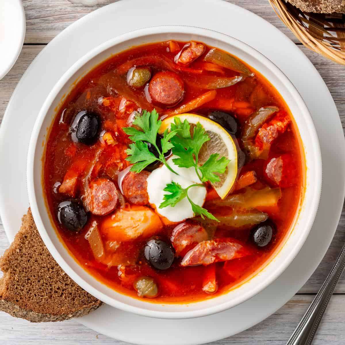 A delicious combination of smoky, salty, and sour, Solyanka soup is made with a variety of meats, pickled vegetables, and a rich beef broth, creating an exciting symphony of flavors.