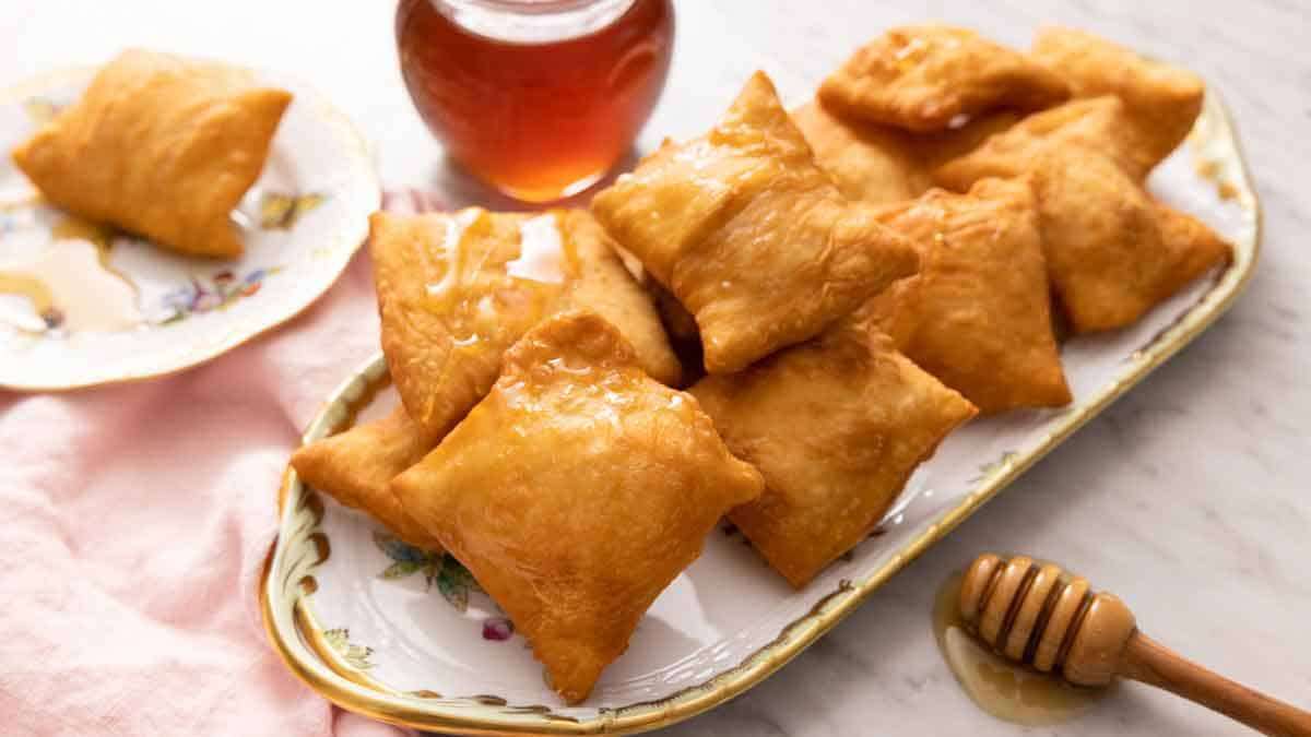 - Working in batches, carefully add dough squares to the oil. (Don’t overcrowd the pot.) Fry, turning as needed, until golden brown on both sides and puffed for about 1 to 2 minutes. (If your dough isn’t puffing in the oil, gently tap them with your strainer to quickly submerge them in the hot oil. This should encourage them to puff.) Let drain on the paper towels. Serve warm, drizzled with honey.