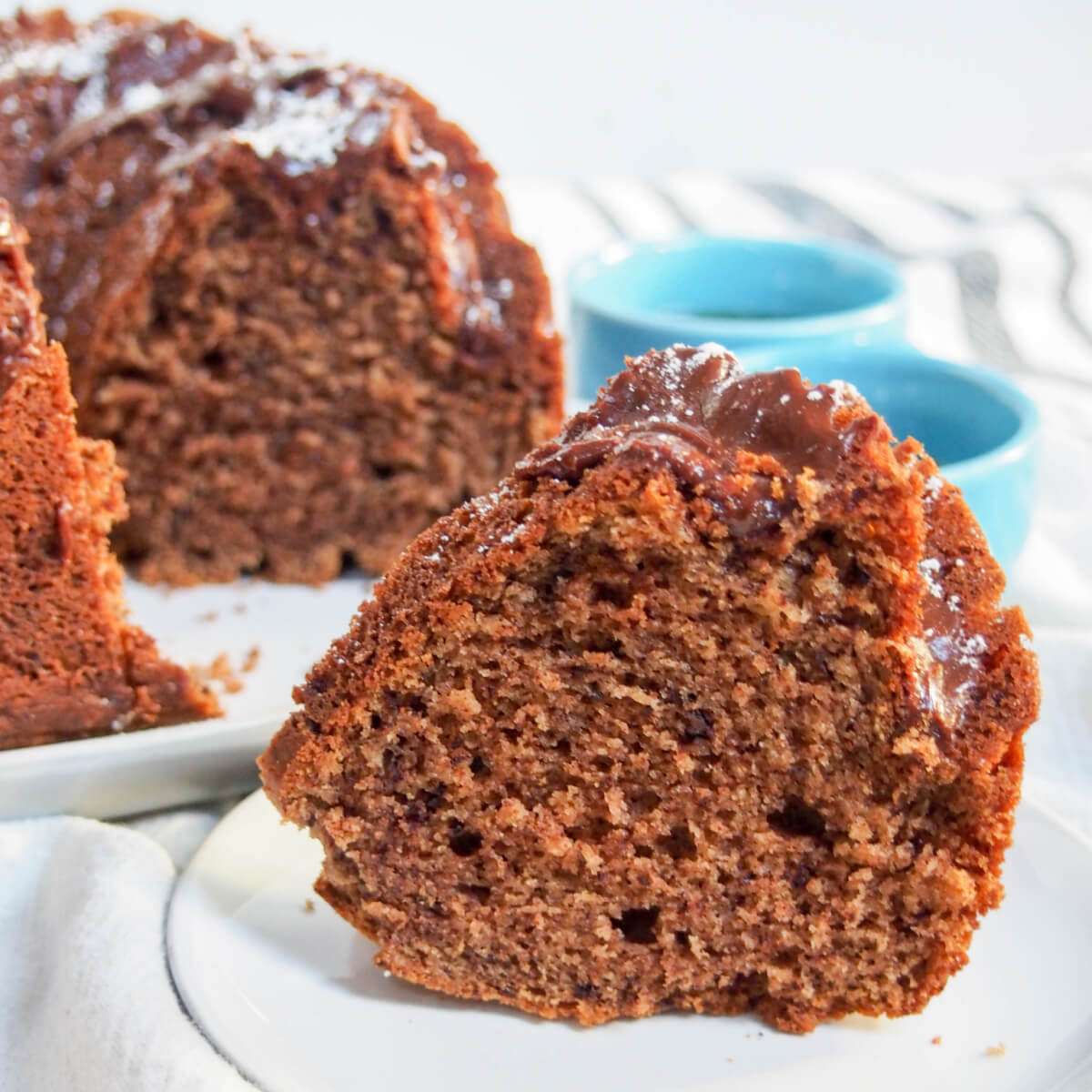- For the glaze, melt the butter and chocolate together and mix. Add the coffee then soft in the powdered sugar a little at a time. Stir to combine. Drizzle the glaze over the cake.
