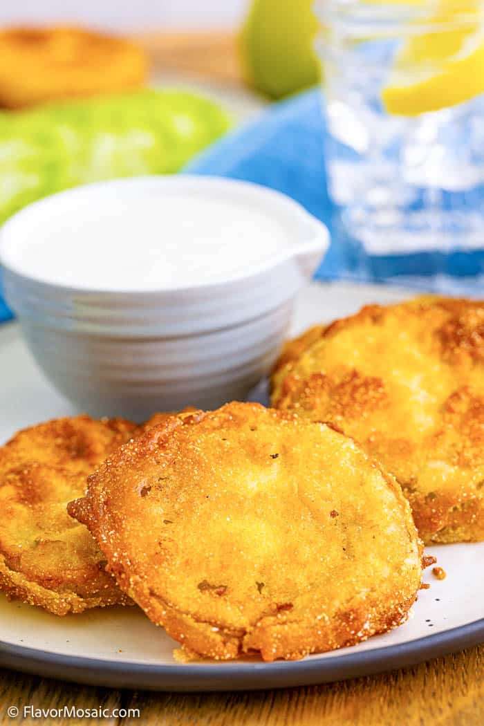 Southern Fried Green Tomatoes are a Southern appetizer that consists of green tomatoes in a cornmeal coating, and fried until crispy golden.