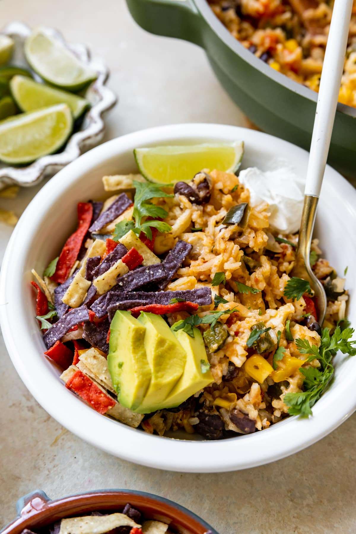 - Serve in bowls and garnish with more cilantro, cheese, limes, crushed tortilla chips, sour cream/greek yogurt, avocado, etc. Enjoy!