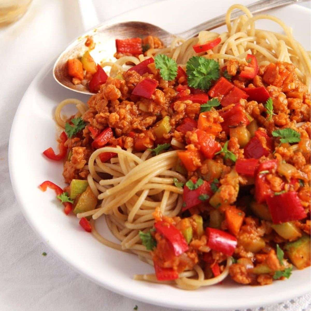 This vegan soya spaghetti recipe is made with soy granules and vegetables. The meatless sauce is delicious, healthy, and satisfying.