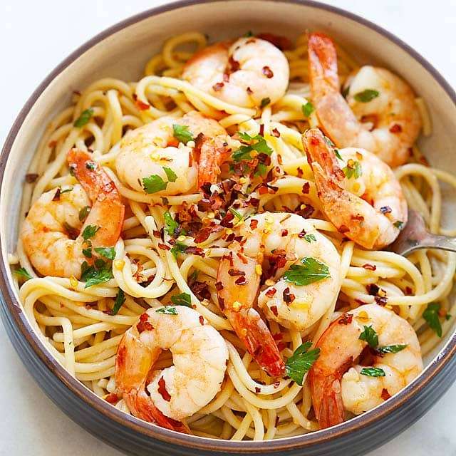 Spaghetti Aglio e Olio - easy delicious pasta with shrimp, olive oil, garlic and chili flakes. This aglio e olio recipe is as good as Italian restaurants!