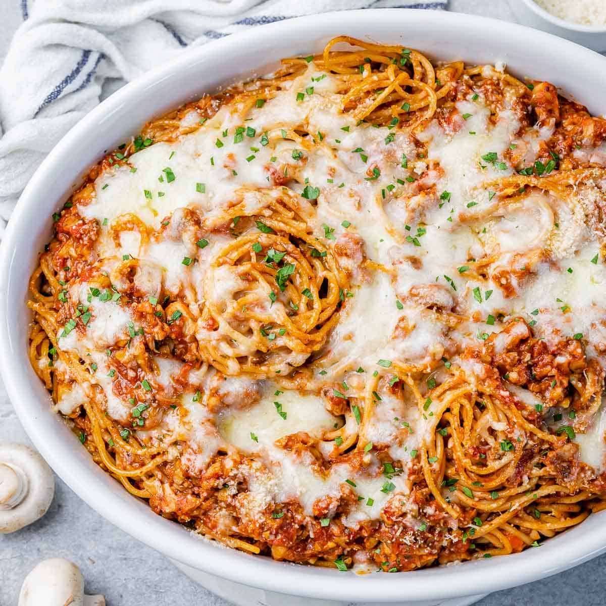 This Spaghetti Casserole is tender pasta tossed in a hearty vegetarian mushroom sauce, then topped with cheese and baked to golden brown perfection. A comforting meal that’s perfect for feeding a crowd!