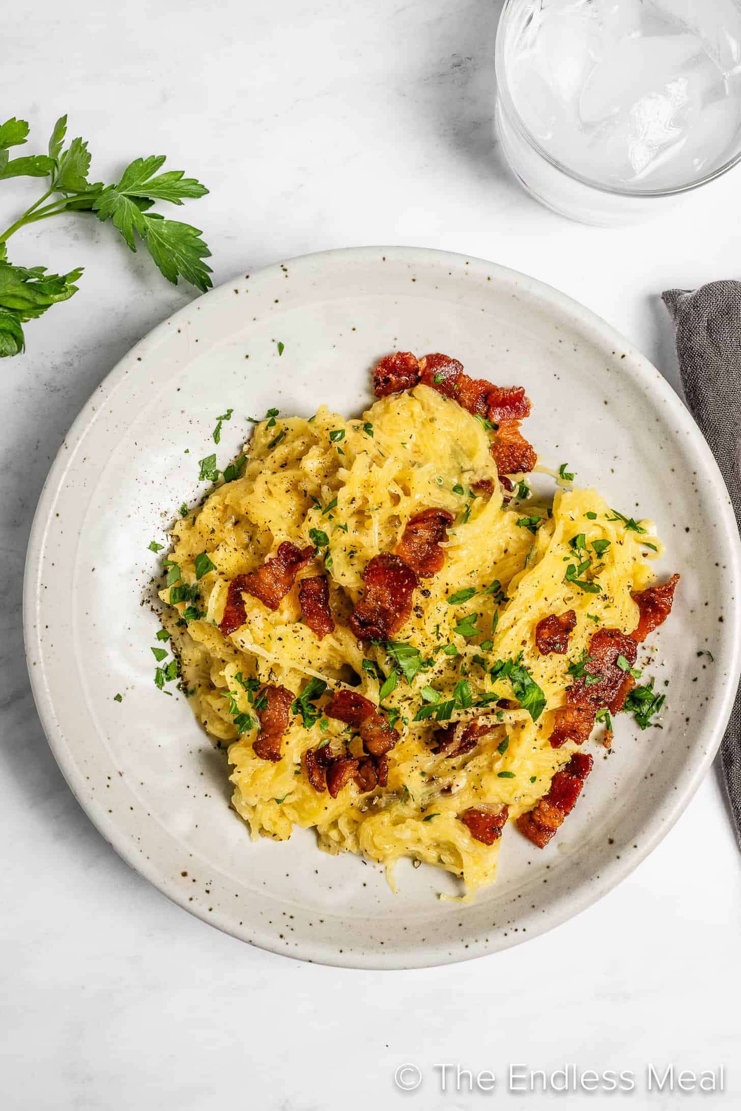 - Serve the spaghetti squash carbonara topped with the crispy bacon and some minced parsley.