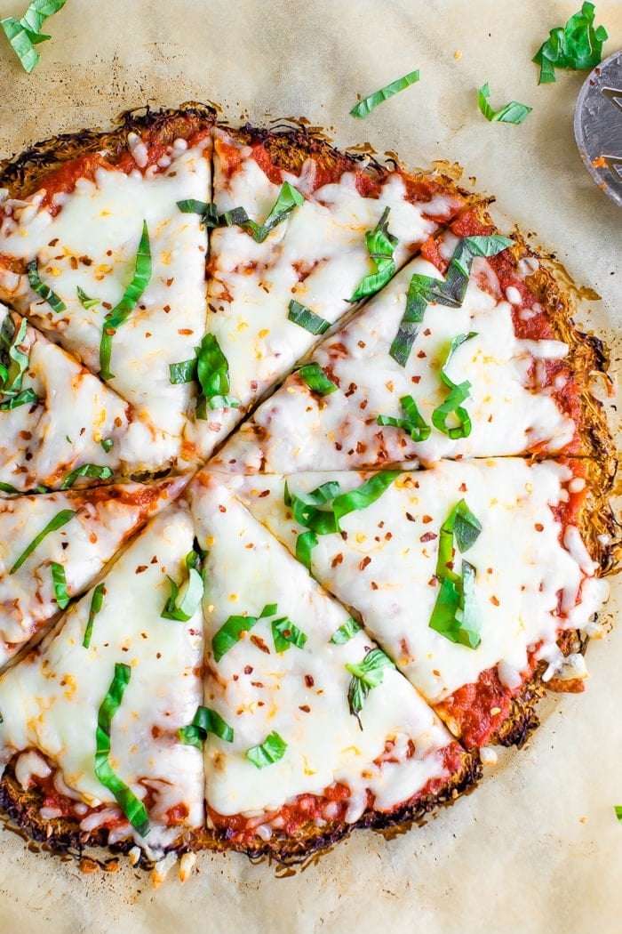 - Bake the crust just until it starts to turn golden, about 30 minutes. Remove it from the oven, add your desired toppings, and return it to the oven. I added pizza sauce, shredded mozzarella and fresh basil.