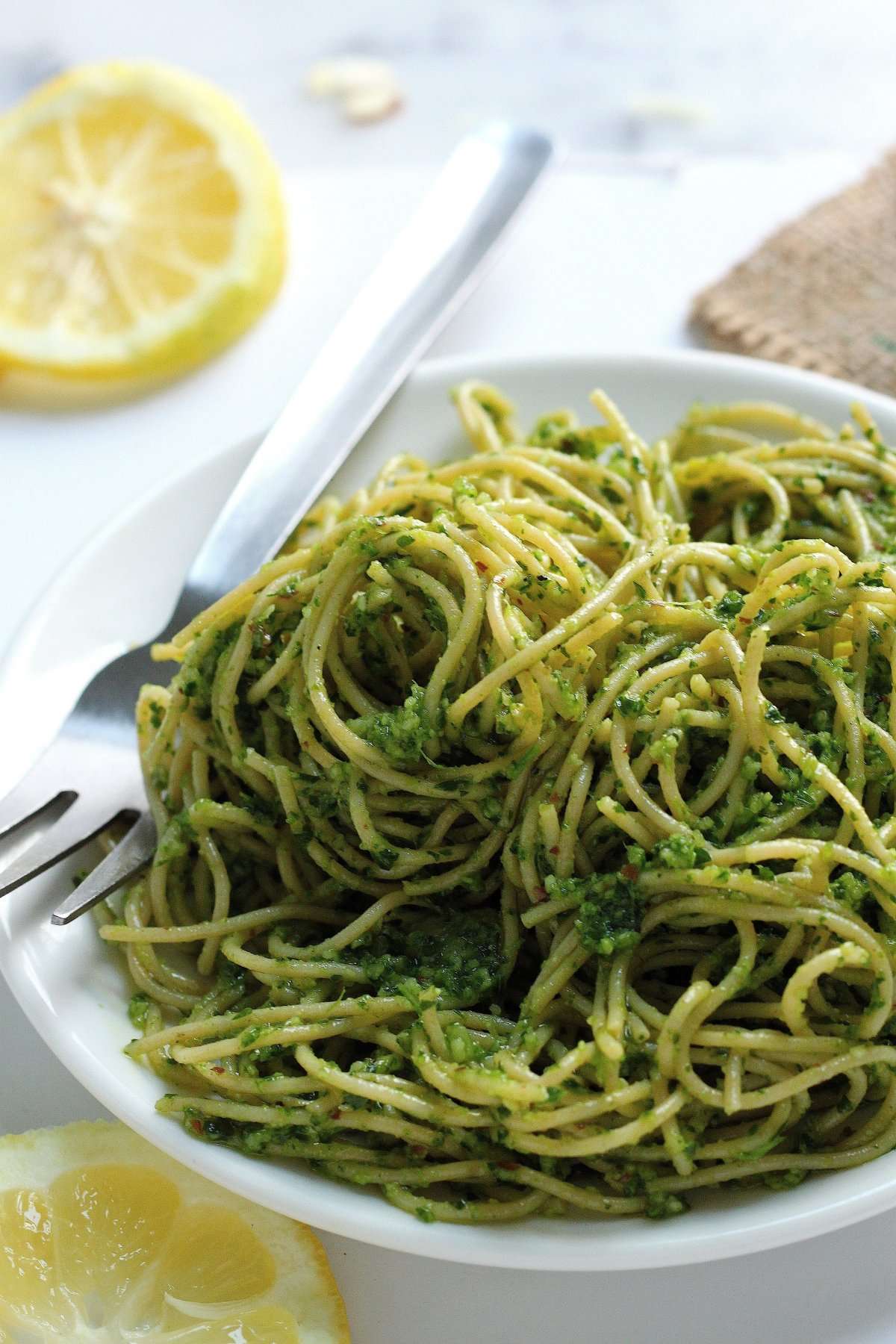 - Toss spaghetti and pesto in a large serving bowl. Add reserved pasta water by the tablespoon until saucy. Season with salt and pepper. Serve at once.