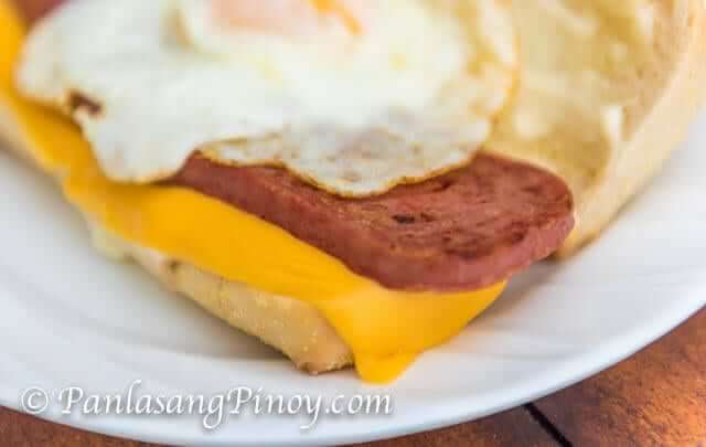 - Spread the mayonnaise on one side of each bread slice. Set one bread slice on a plate – side with mayonnaise facing up. Put the American cheese followed by the Spam and egg. Top with the remaining bread slice – side with mayonnaise facing down.