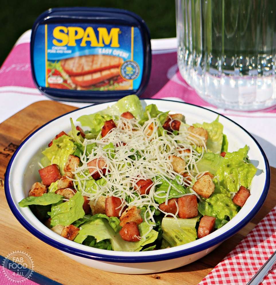 - Add the croutons and SPAM and lightly toss.