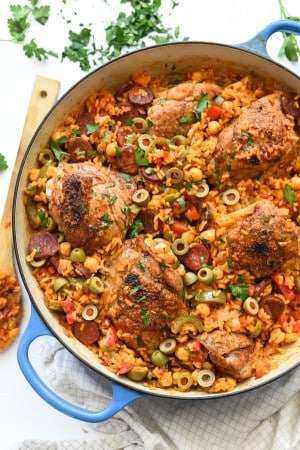 Chicken thighs are nestled in Spanish-flavored rice with Spanish chorizo, green olives, and garbanzo beans for the ultimate one-pot meal.