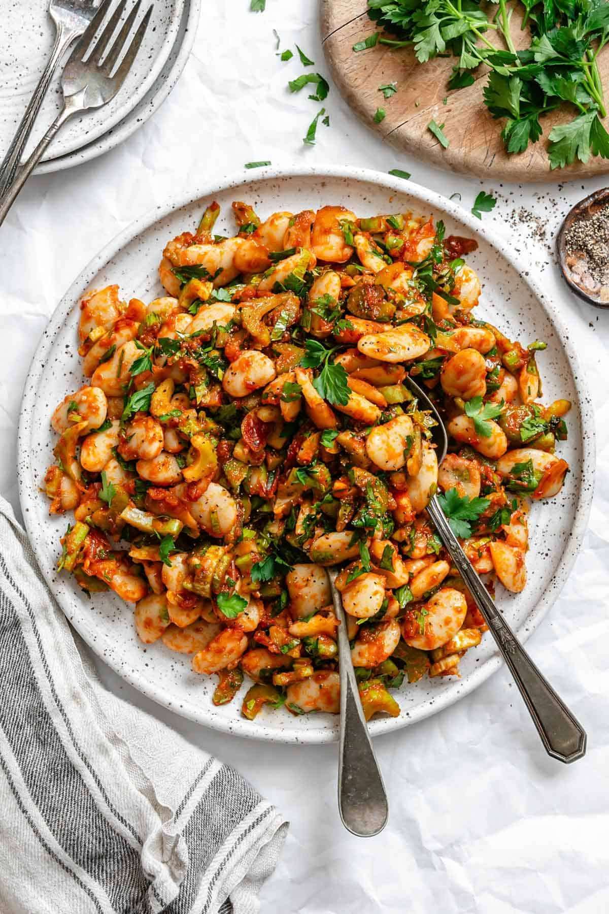 These beans are rich, smokey and tangy and addictive. They can be served warm or cold and are full of Spanish flavors like garlic and smoked paprika.