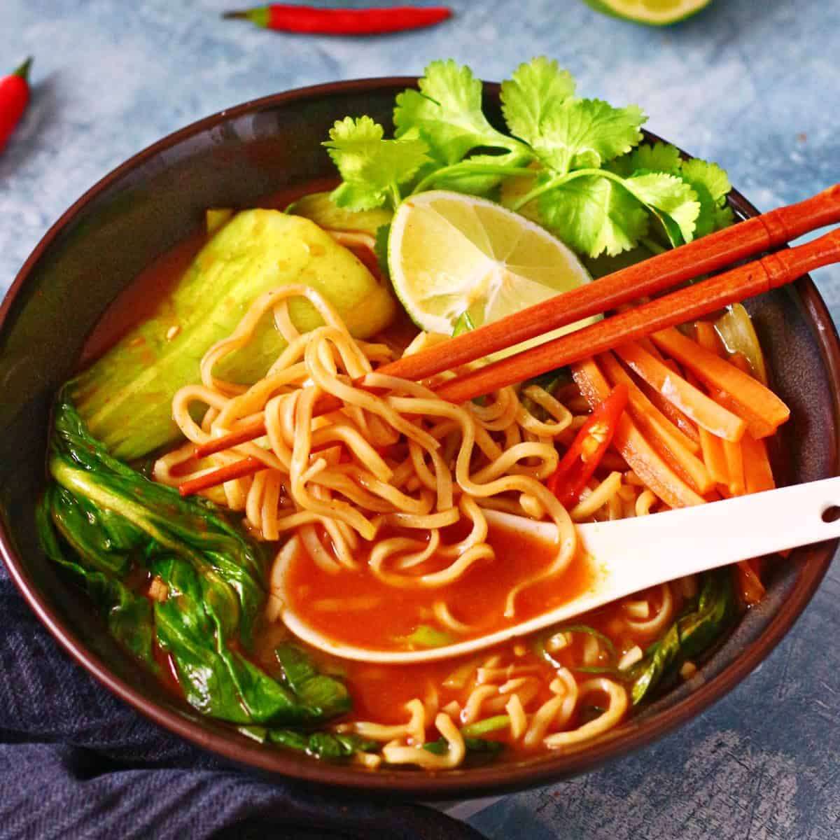 This spicy Asian Noodle Soup features silky egg noodles soaked in a flavor-packed broth enriched with fresh aromatics, chili paste and bok choy. This quick and easy, one-pot recipe comes together in only 10 minutes.