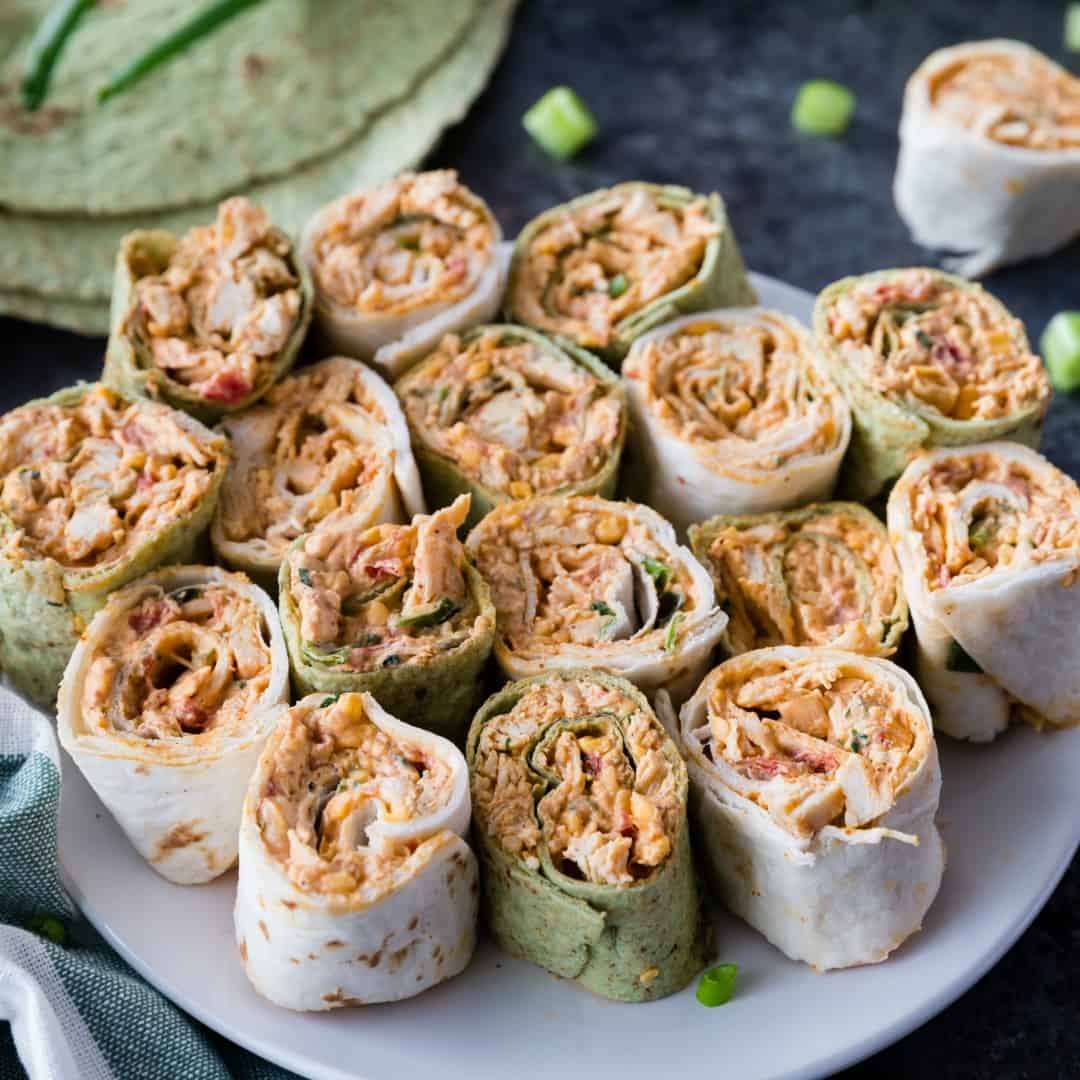 Spicy Chicken Tortilla Roll-Ups are full of amazing flavors perfect for any party! These easy chicken pinwheels can be made ahead of time & served up later!