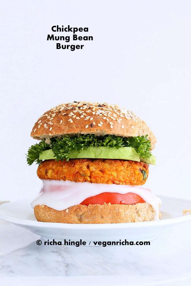 These Spicy Chickpea Burgers are super flavorful and packed with roasted red peppers and a homemade taco spice blend to really give it that spicy kick! This chickpea burgers recipe includes mung dal, or petite yellow lentils, which are split and de-husked green mung beans.
