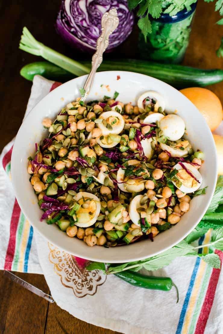 My Spicy Chickpea Salad is the perfect spring and summer side. Loaded with crunchy cucumbers & shredded cabbage, piquant red onions, herbaceous cilantro & mint, spicy citrus-marinated chickpeas, and protein-packed eggs, this colorful and flavorful garbanzo bean salad recipe is destined to become a festive favorite.