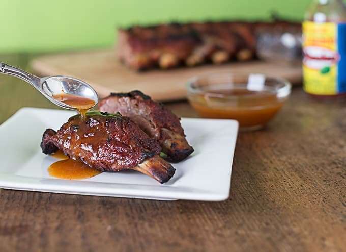 - Grill ribs for about 5 minutes on each side to a nice caramelized color brushing with ¼ cup of the reserved marinade. ( Your level of charred edges is your preference.)