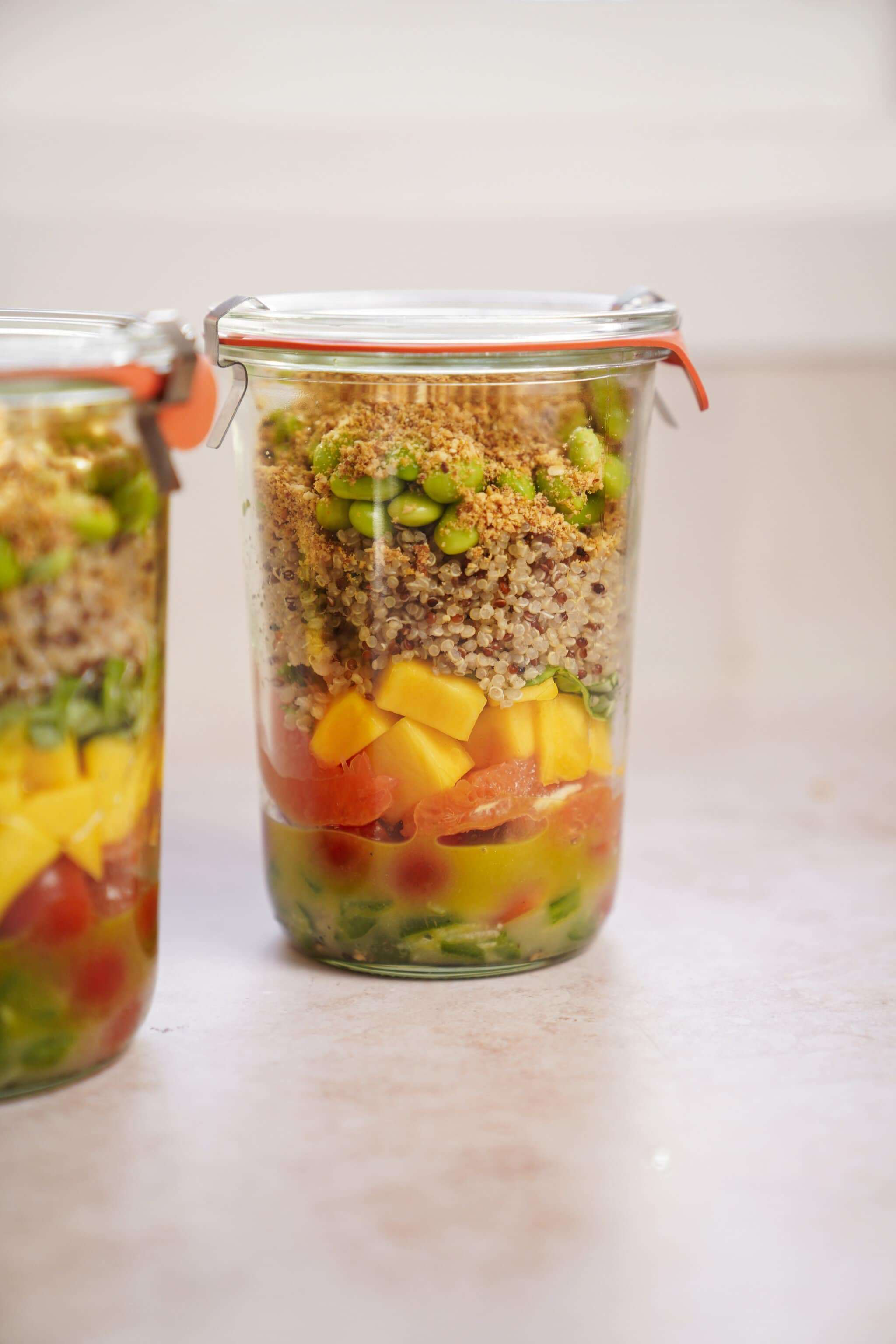 - To assemble, use a 750ml / 26oz jar. Divide the ingredients between the two jars, starting with the dressing at the bottom followed by the diced jalapenos, halved tomatoes, cubed mango, chopped basil, cooked quinoa, orange segments, edamame beans and topping with the crumble.