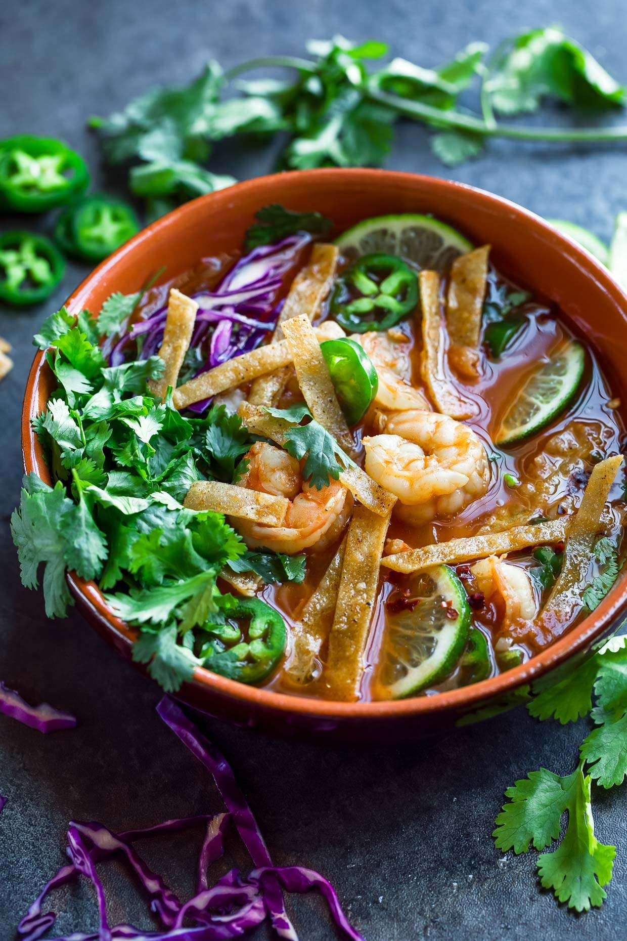 Spicy Shrimp Tortilla Soup ready in under 30 minutes and so crazy tasty! We are so totally in love with this delicious dairy-free soup.Yields approx. 4 cups or 2 large bowls.