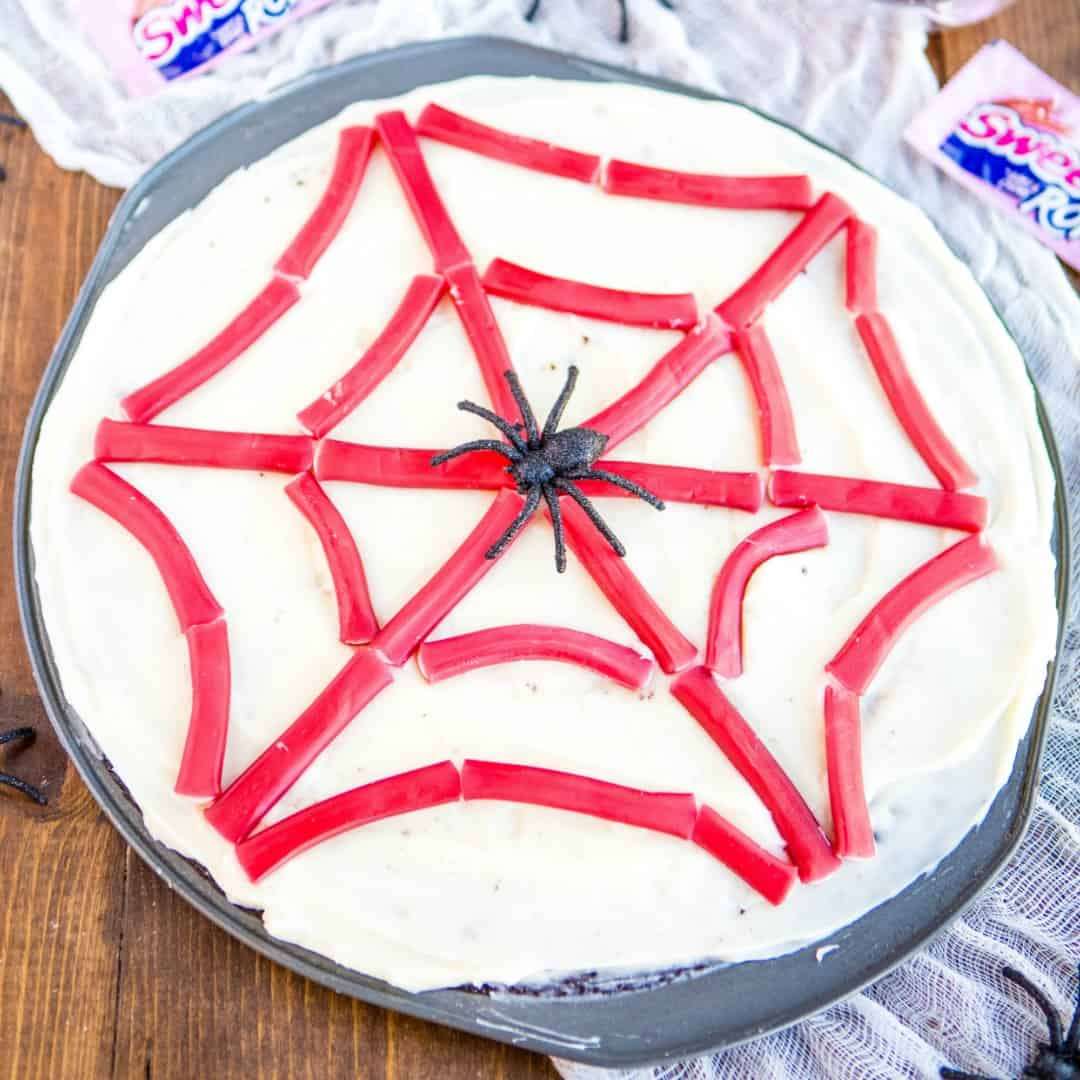 Spider Web Brownie Pizza is an easy dessert that'll be the talk of your Halloween party!! It's loaded with cream cheese frosting, SweeTARTs Ropes & spiders!